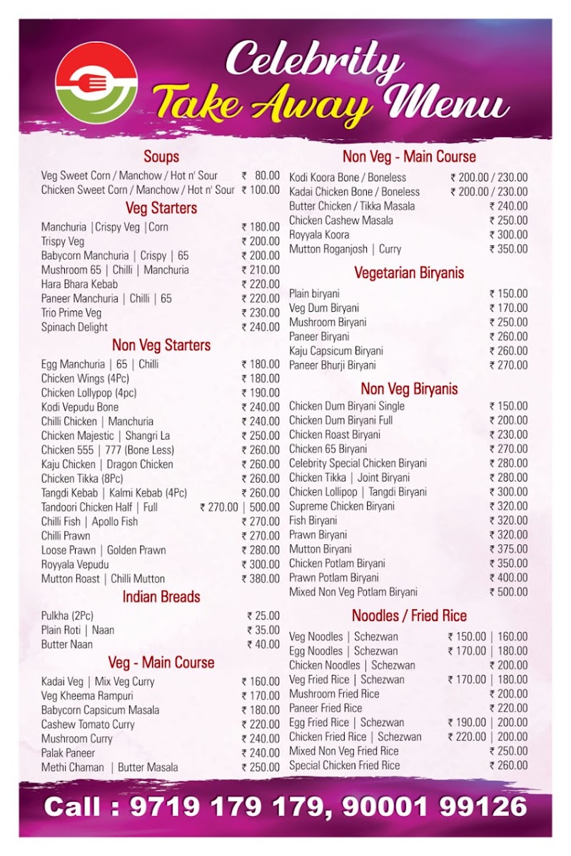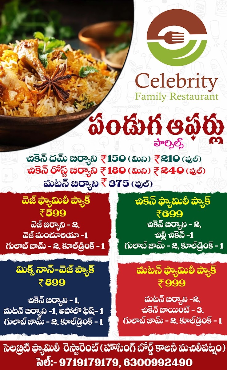 Welcome to Celebrity Family Restaurant, a hidden gem nestled in Machilipatnam, Andhra Pradesh. Renowned for its ever-evolving menu, this charming eatery is a must-visit for food enthusiasts. Diners rave about unique offerings like the Celebrity Spinach Delight, alongside robust favorites such as Butter Naan with Butter Chicken and Chicken Fry PC Biryani. The ambiance strikes a perfect balance, inviting both family gatherings and friendly outings with a modern aesthetic.